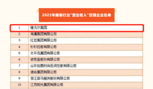 雅戈尔再度荣登榜首!中国服装协会公布“2022年服装行业百强企业”