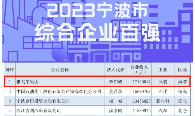 2023宁波综合企业百强榜发布:雅戈尔连续第三年蝉联第一!