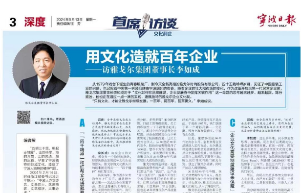 5月13日,《宁波日报》第三版刊发雅戈尔集团董事长 李如成 专访文章《用文化造就百年企业》,在宁波日报报业集团官方平台“甬派”APP和“东南财金”微信公众号同步发布。