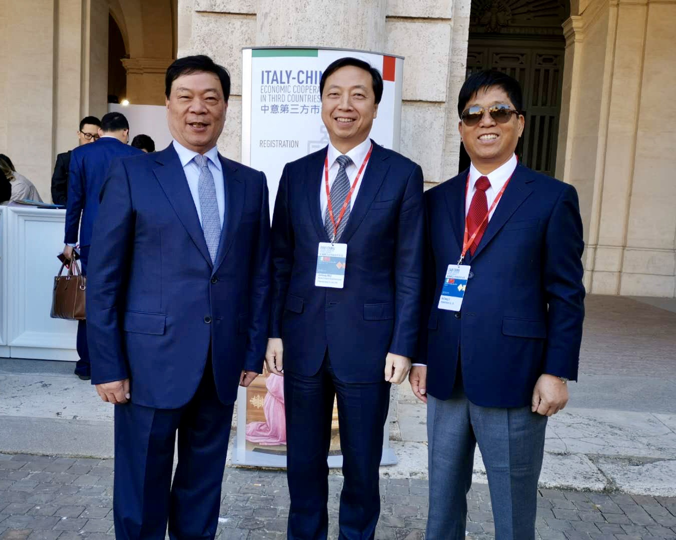 (图为:宁波的“三巨头”在首届中意第三方市场合作论坛会场前合影。雅戈尔集团董事长李如成(图右)、杉杉控股董事局主席郑永刚(图左)、宁波舟山港集团董事长毛剑宏(图中))