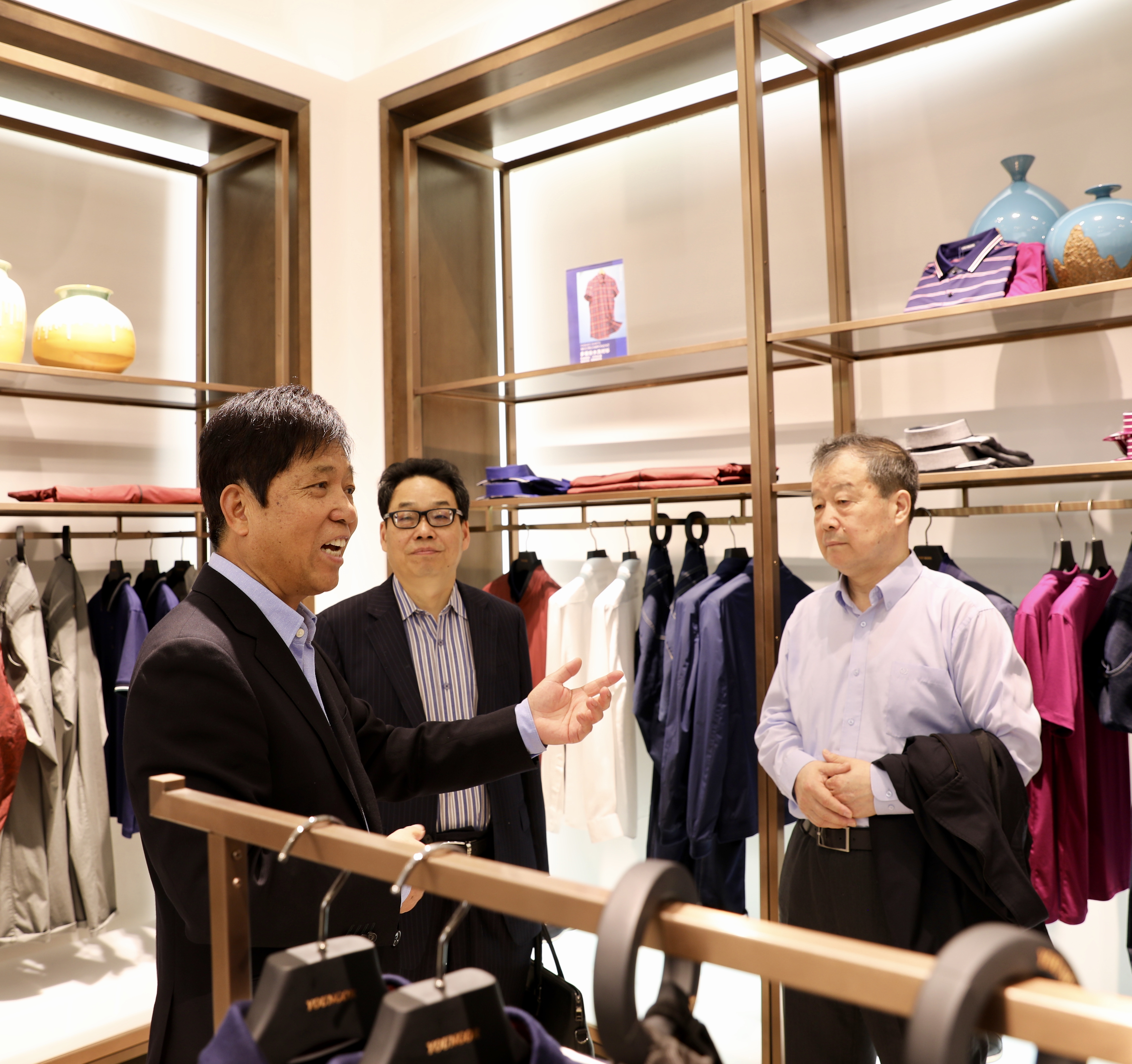 图为李如成董事长向调研组介绍雅戈尔品牌服装