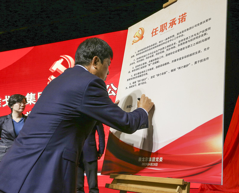 雅戈尔集团党委书记李如成同志表态发言,集团党委将继续坚持和加强党的全面领导,牢固树立四个意识,确保班子在思想上、组织上更强,带领党员职工发挥好作用,为社会提供优质的服务,为企业增加核心竞争力,为股东创造更大的价值,为员工创造卓越幸福感。石碶街道党工委书记张朝晖同志讲话,张书记祝贺雅戈尔顺利完成换届选举工作,代表街道党工委,对雅戈尔集团党委下一阶段的工作提出四点希望:一是始终发挥政治建设的核心作用;二是持续发挥思想建设的领航作用;三是不断深化作风建设的警示作用;四是坚持推进党支部的规范化建设。 今年是集团成立四十周年,面对新起点和新要求,集团党委将团结带领全体党员职工,围绕中心、服务大局,为“创国际品牌、筑百年企业”提供坚强的组织基础。从四方面继续围绕发展抓党建、抓好党建促发展,一是坚定政治方向,发挥政治核心作用,深入开展“不忘初心,牢记使命”主题实践活动;二是从大局出发,努力抓好生产经营工作,党委要做好谋思路、扩格局工作。三是加强党建品牌建设,发挥组织力,不断增强广大党员使命感和荣誉感;四是强化党群工作,推进企业文化建设,使企业发展更具感召力和认同感。