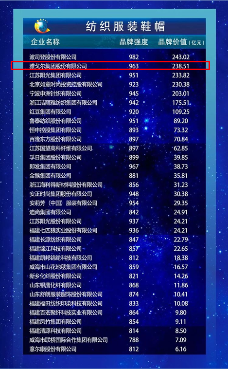 2019中国品牌价值评价信息发布,雅戈尔品牌价值238.51亿