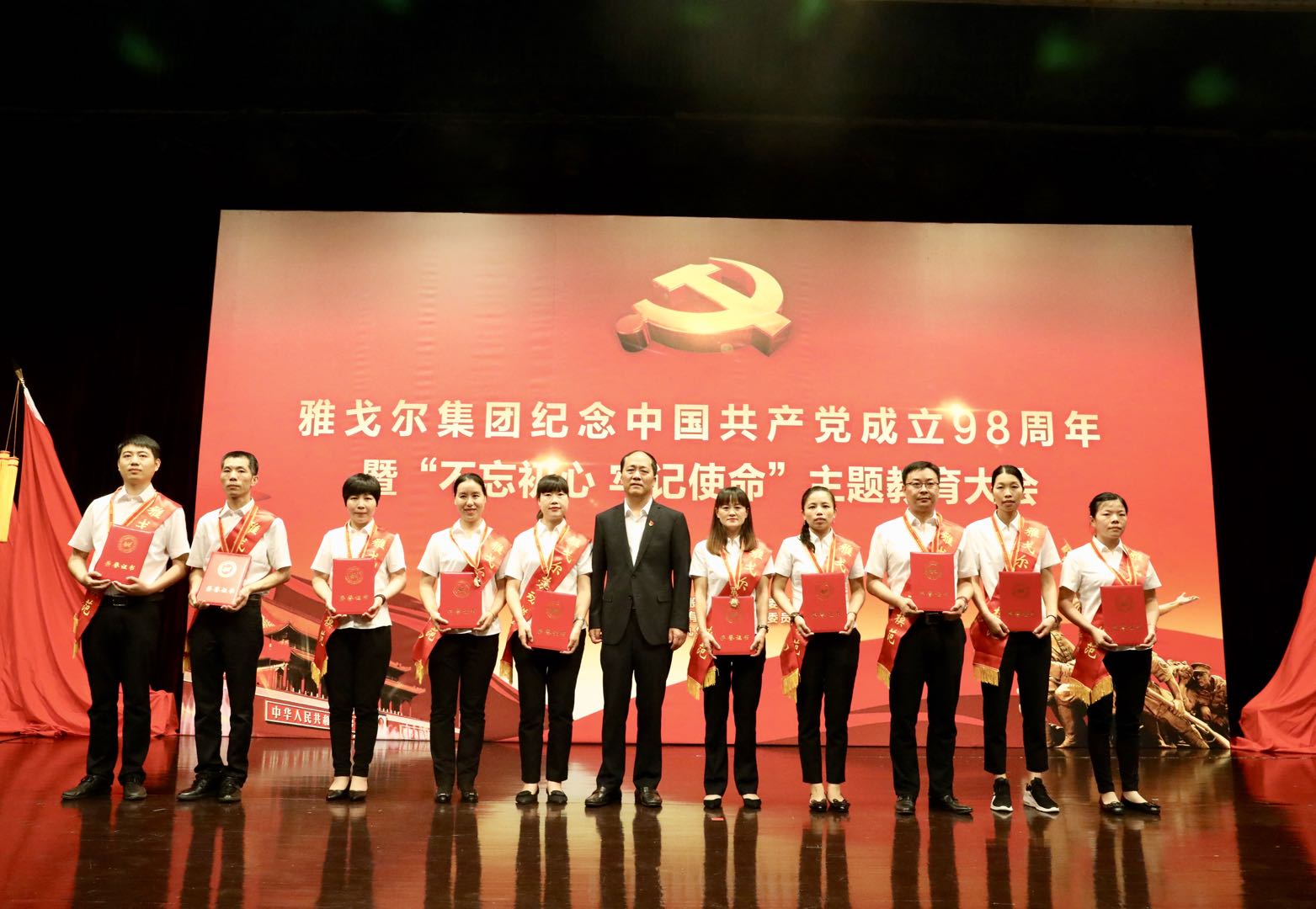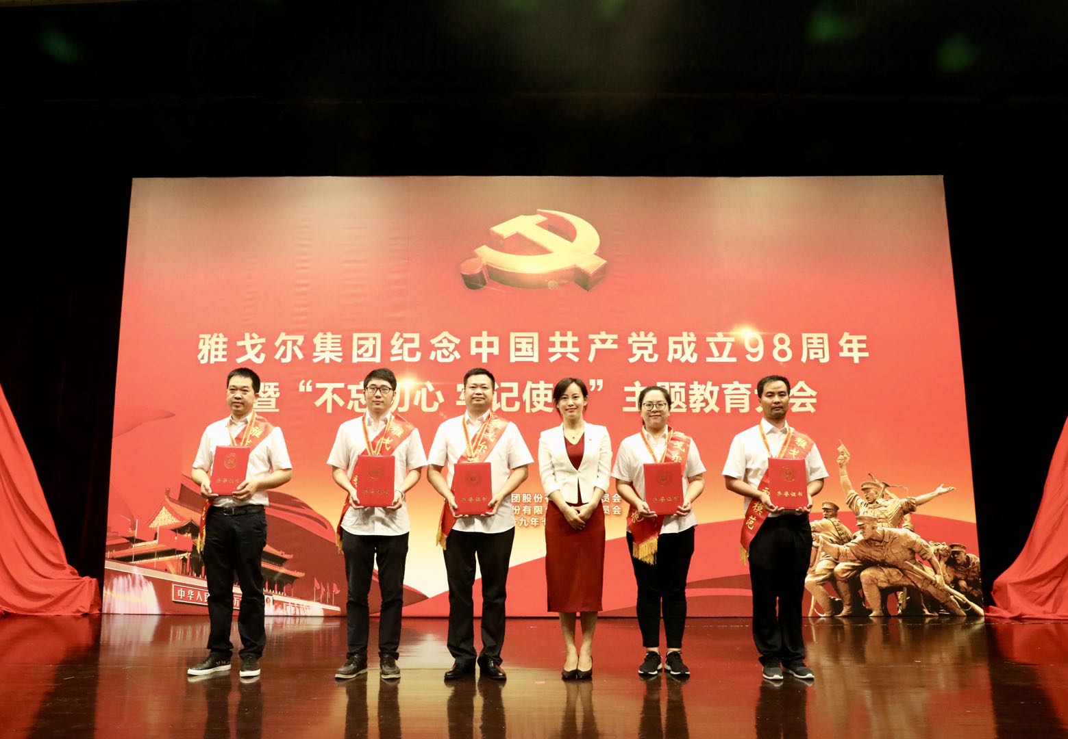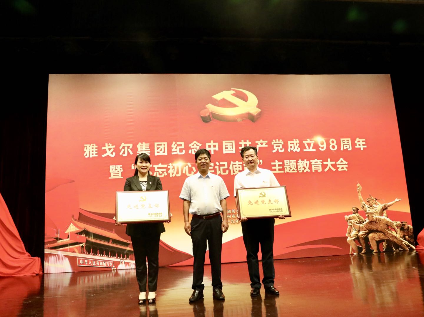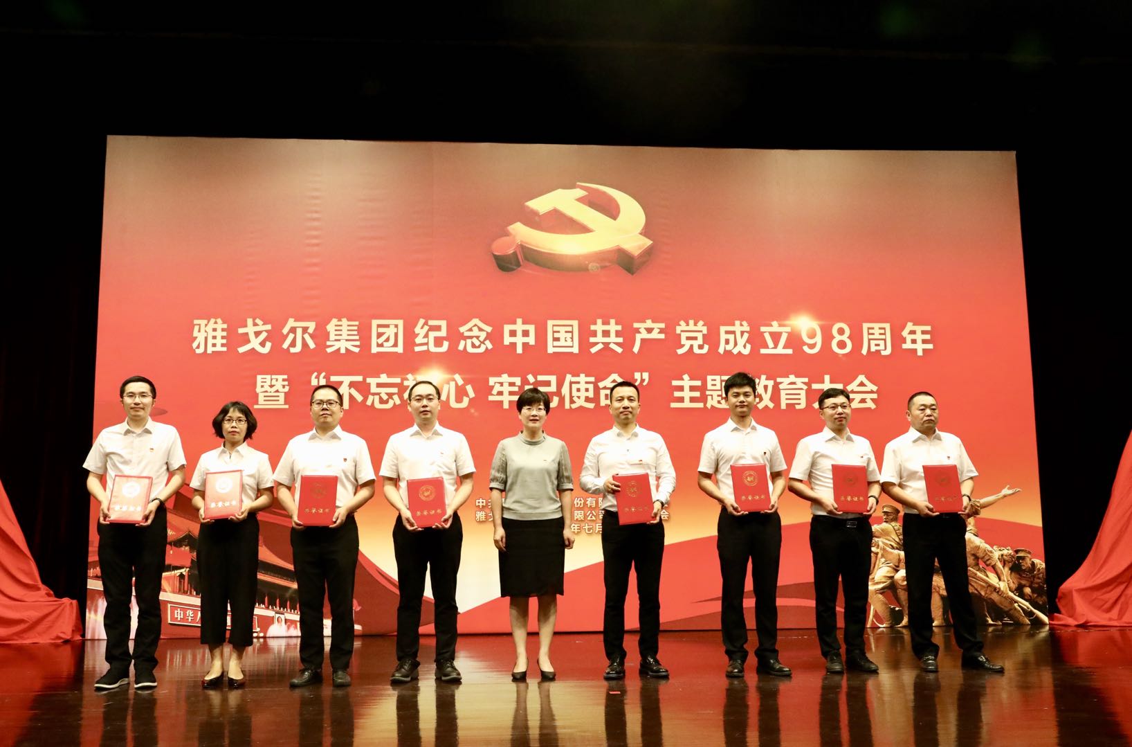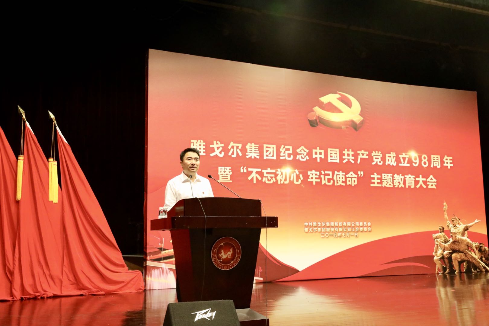 2019年7月1日,雅戈尔集团隆重召开纪念中国共产党成立98周年暨“不忘初心 牢记使命”主题教育大会,对一批先进党支部、优秀共产党员、优秀党务工作者、劳动模范进行集中表彰,并同时开展“不忘初心 牢记使命”主题教育大会,组织党员职工学习习近平新时代中国特色社会主义思想专题党课。集团党委班子、全体党员、劳动模范、中层干部共400余人参加会议。