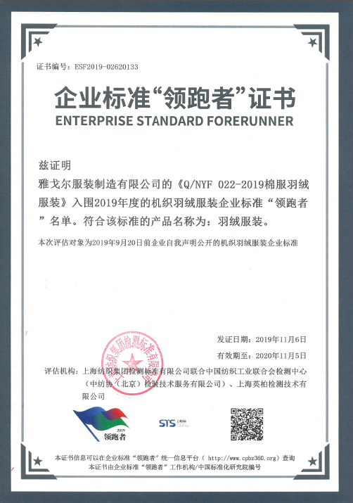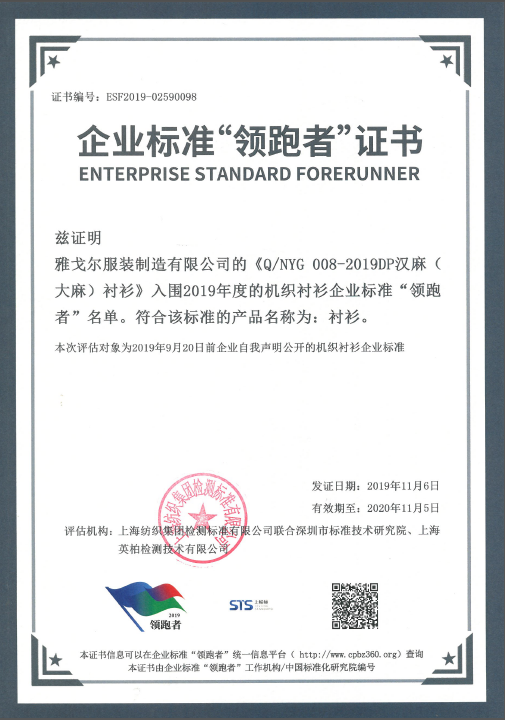 2019年11月6日,2019企业标准领跑者年度大会在山东济南召开,会议公布第一批企业标准“领跑者”名单,雅戈尔DP汉麻衬衫成为机织衬衫企业标准“领跑者”,棉服羽绒服成为机织羽绒服装“领跑者”。