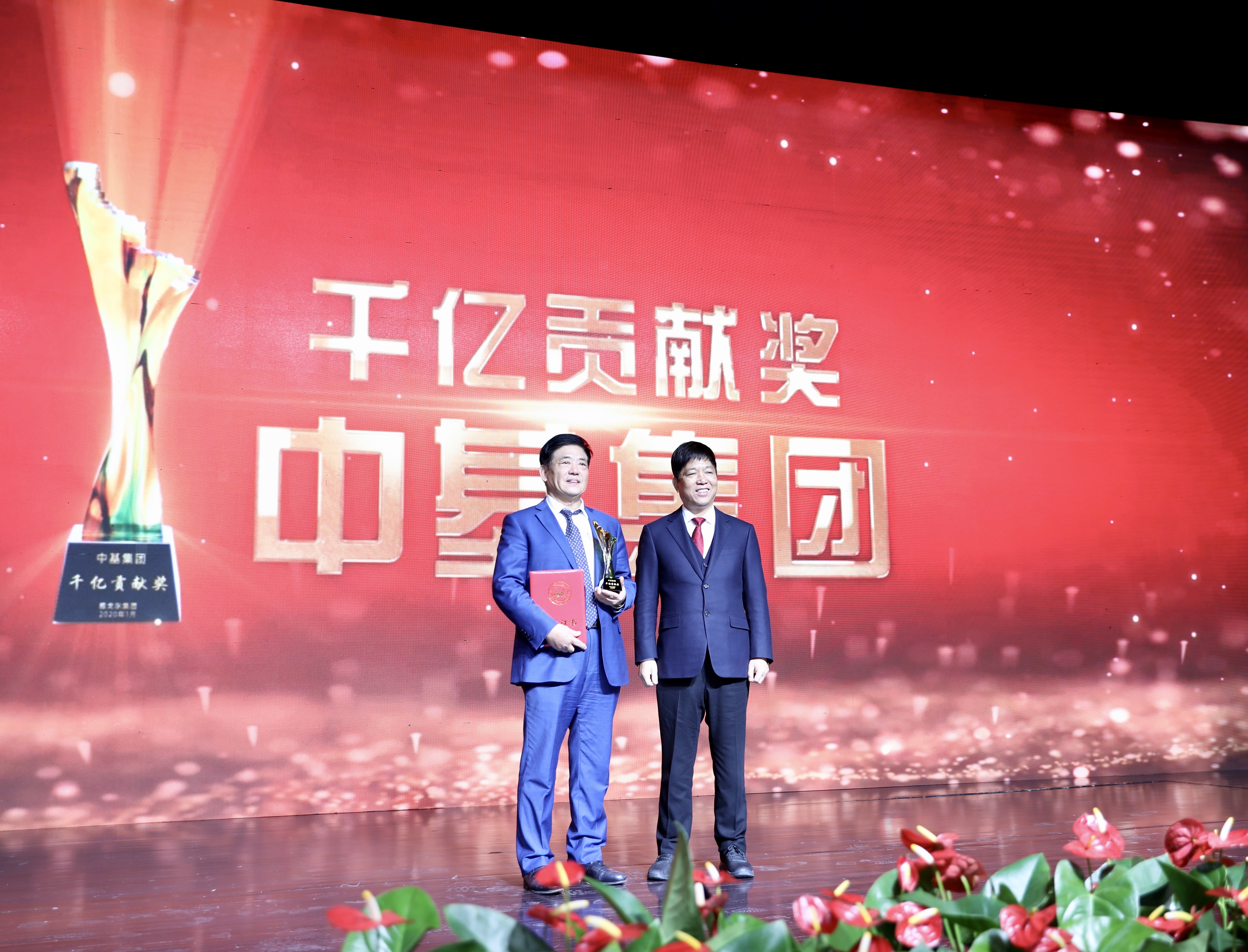 中基集团获得“千亿贡献奖”,以表彰中基集团在营销收入上对雅戈尔集团所作出的突出贡献。 中基集团董事长周巨乐代表企业领奖并发表获奖感言。